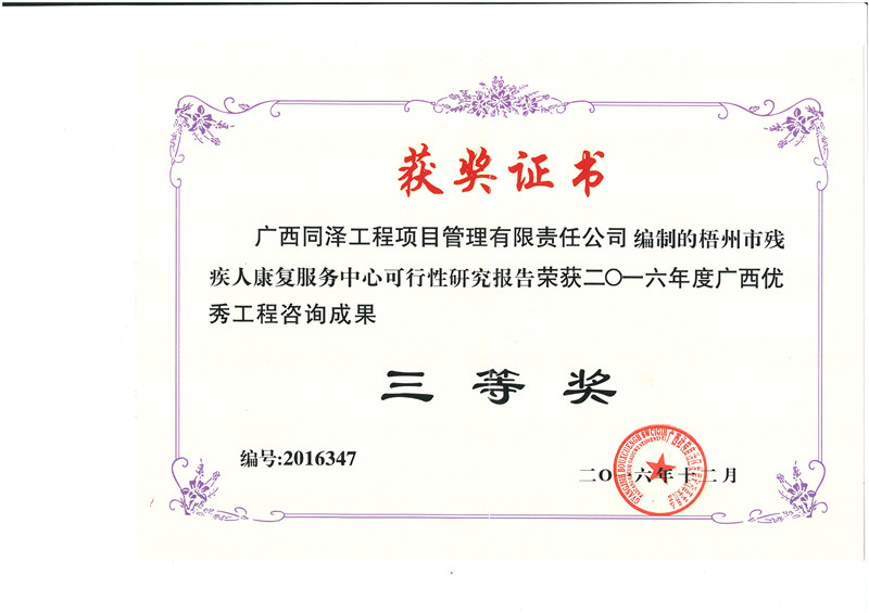 梧州市殘疾人康復服務中心可行性研究報告榮獲2016年度廣西優秀工程咨詢成果三等獎